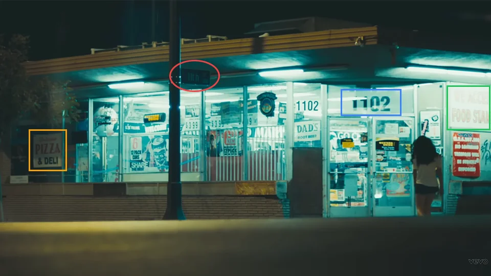 Lana Del Rey is seen walking past a convenience store at 1102 Fremont Street in downtown Las Vegas. The store's distinctive green-and-red facade, "Pizza & Deli" sign, and the street number 1102 are clearly visible in both the music video and Google Street View.